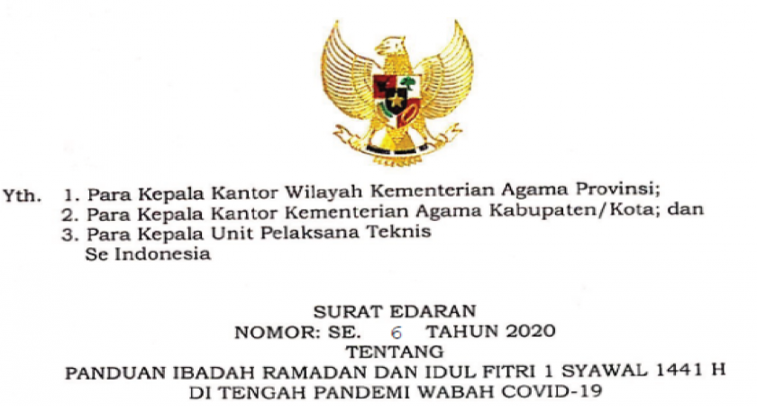 Surat Edaran Menag Nomor 6 Tahun 2020 Tentang Panduan Ibadah Ramadhan dan Idul Fitri 1 Syawal 1441 H Di Tengah Pandemi Covid-19