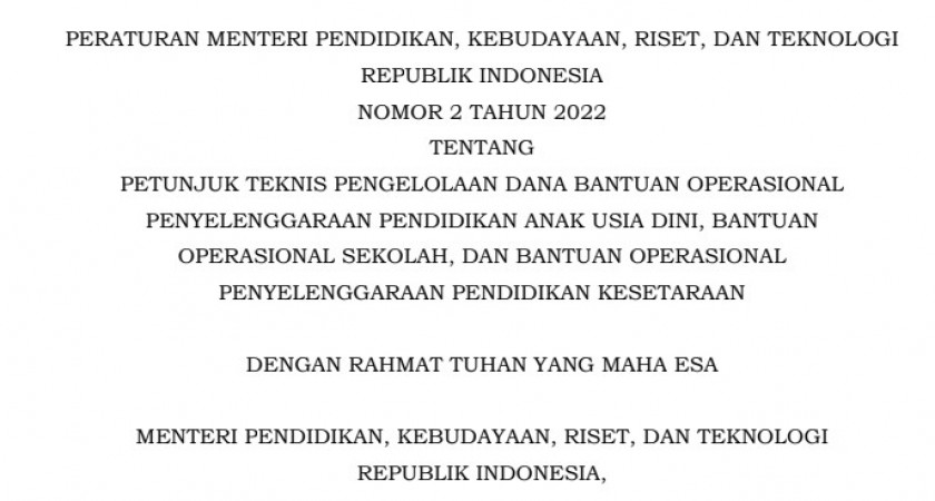 Juknis BOS & BOP Tahun 2022, Permendikbudristek No 2 Tahun 2022