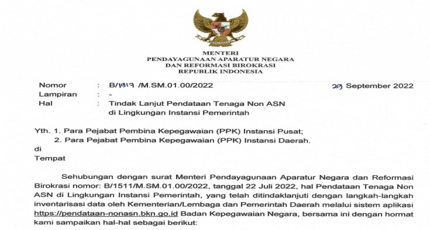 Sehubungan dengan surat Menteri Pendayagunaan Aparatur Negara dan Reformasi Birokrasi nomor: B/1511/M.SM.01.00/2022, tanggal 22 Juli 2022, hal Pendataan Tenaga Non ASN di Lingkungan Instansi Pemerintah, yang telah ditindaklanjuti dengan langkah-langkah inventarisasi data oleh Kementerian/Lembaga dan Pemerintah Daerah melalui sistem aplikasi https://pendataan-nonasn.bkn.go.id Badan Kepegawaian Negara, bersama ini dengan hormat kami sampaikan hal-hal sebagai berikut: