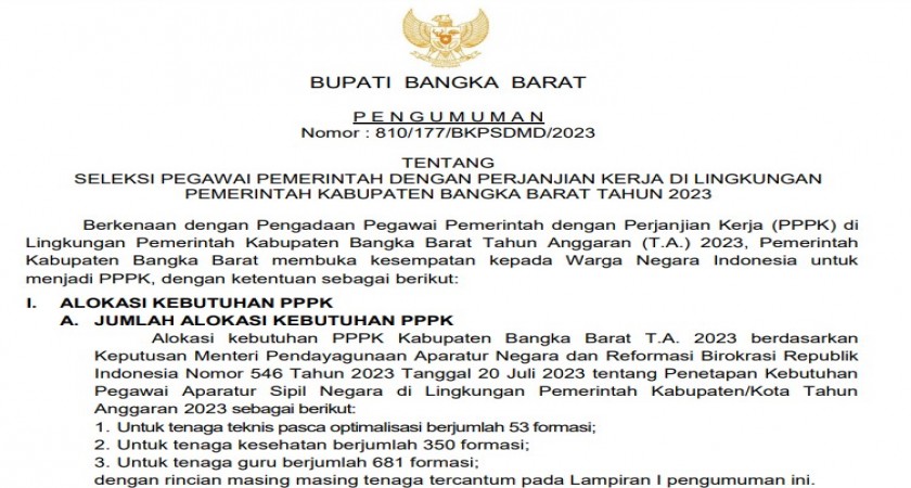 Berkenaan dengan Pengadaan Pegawai Pemerintah dengan Perjanjian Kerja (PPPK) di Lingkungan Pemerintah Kabupaten Bangka Barat Tahun Anggaran (T.A.) 2023, Pemerintah Kabupaten Bangka Barat membuka kesempatan kepada Warga Negara Indonesia untuk menjadi PPPK.