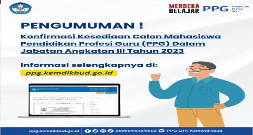 Kabar gembira bagi guru yang ingin mengikuti pendidikan profesi guru (PPG) Dalam Jabatan tahun 2023. Direktorat Jenderal Guru dan Tenaga Kependidikan, melalui Direktorat Pendidikan Profesi Guru akan membuka proses Konfirmasi Kesediaan bagi Calon Mahasiswa PPG Dalam Jabatan Angkatan III Tahun 2023 Melalui surat edaran nomor 2495/B2/GT.00.02/2023 pada 2 November 2023 pada laman resmi https://ppg.kemdikbud.go.id/