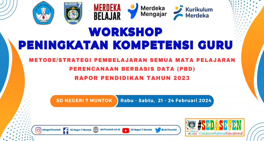 Beranjak dari hal tersebut, SD Negeri 7 Muntok melaksanakan kegiatan Workshop Pengembangan Kompetensi Guru dari hari Rabu s.d Sabtu, 21 s.d 24 Februari 2024 yang diikuti oleh seluruh Pendidik dan Tenaga Kependidikan. Dalam sambutannya, kepala SD Negeri 7 Muntok Ibu Menik Indri Mistiasih,S.Pd.SD menyampaikan bahwa workshop ini  bertujuan untuk meningkatkan pemahaman, kompetensi guru dan memastikan implementasi kurikulum merdeka berjalan dengan maksimal. Adapun narasumber kegiatan ini adalah Ibu Tini Suryati,S.Pd.