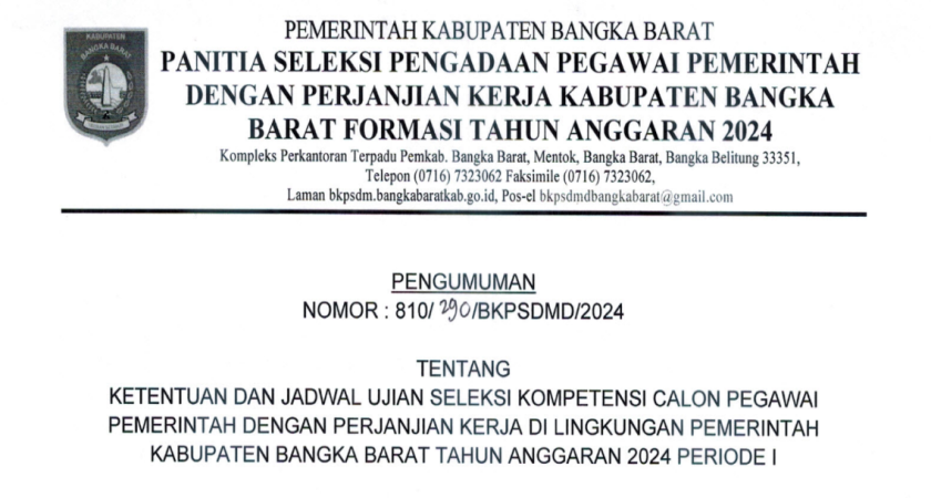Merujuk pada Pengumuman Ketua Panitia Seleksi Pengadaan Pegawai Pemerintah Dengan Perjanjian Kerja Kabupaten Bangka Barat Formasi Tahun Anggaran 2024 Nomor: 810/455/BKPSDMD/2024 tanggal 7 November 2024 tentang Hasil Seleksi Administrasi Pasca Sanggah Calon Pegawai Pemerintah Dengan Perjanjian Kerja di Lingkungan Pemerintah Kabupaten Bangka Barat Tahun Anggaran 2024 Periode I dan menindaklanjuti Surat Deputi Bidang Sistem lnformasi dan Digitalisasi Manajemen ASN BKN Nomor 10331/B-KS.04.01/SD/E/2024 tentang Penyampaian Jadwal Seleksi Kompetensi PPPK Tahun Anggaran 2024 Tahap I di Lokasi Dalam Negeri, dengan ini kami informasikan hal­-hal terkait Seleksi Kompetensi Calon Pegawai Pemerintah Dengan Perjanjian Kerja Kabupaten Bangka Barat T.A. 2024.