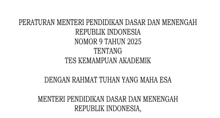 Dalam rangka memenuhi mandat konstitusional untuk menyediakan pendidikan yang bermutu bagi seluruh warga negara tanpa diskriminasi, Kementerian Pendidikan Dasar dan Menengah (Kemendikdasmen) melalui Badan Standar, Kurikulum, dan Asesmen Pendidikan (BSKAP) menetapkan Peraturan Menteri Pendidikan Dasar dan Menengah Nomor 9 Tahun 2025 tentang Tes Kemampuan Akademik (TKA). Peraturan ini telah diundangkan pada tanggal 3 Juni 2025 dan menjadi momen penting dalam upaya penguatan sistem penilaian capaian akademik yang terstandar, objektif, dan inklusif di seluruh jenjang pendidikan dasar dan menengah.