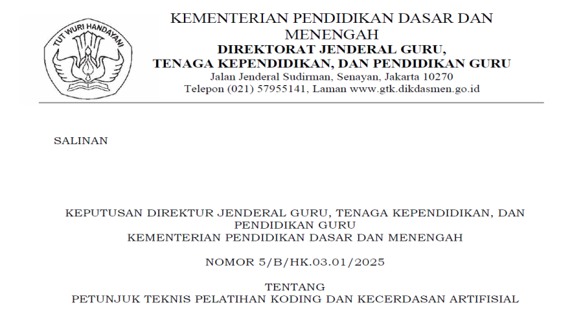 Keputusan Dirjen GTK* Nomor 5/B/HK.03.01/2025 tanggal 14 Mei 2025 tentang Petunjuk Teknis Pelatihan Koding dan KA .
