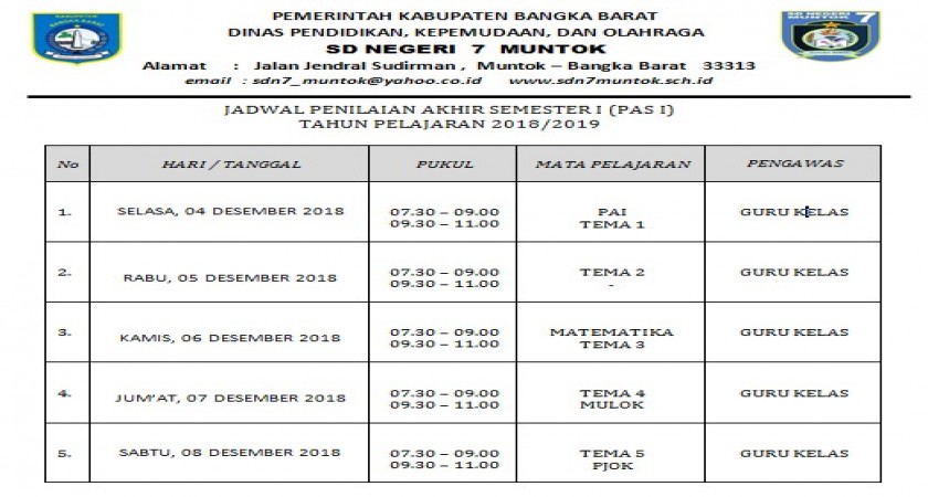 Jadwal Pelaksanaan PAS Ganjil SD Negeri 7 Muntok Tahun Pelajaran 2018/2019