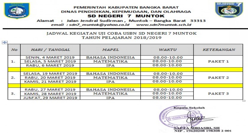 Jadwal Kegiatan Try Out USBN 2019 SD Negeri 7 Muntok