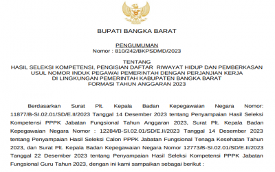 HASIL SELEKSI KOMPETENSI, PENGISIAN DAFTAR RIWAYAT HIDUP DAN PEMBERKASAN USUL NOMOR INDUK PEGAWAI PEMERINTAH DENGAN PERJANJIAN KERJA DI LINGKUNGAN PEMERINTAH KABUPATEN BANGKA BARAT FORMASI TAHUN ANGGARAN 2023