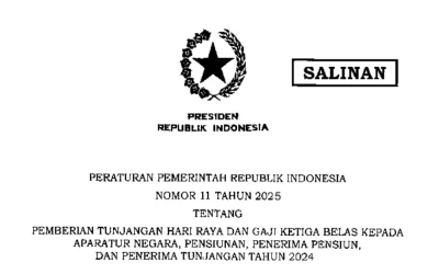 Peraturan Pemerintah atau PP Nomor 11 Tahun 2025 PDF Tentang Pemberian Tunjangan Hari Raya Dan Gaji Ketiga Belas Kepada Aparatur Negara,Pensiunan, Penerima Pensiun, dan Penerima Tunjangan Tahun 2025