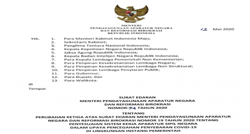 Hal ini tertuang dalam Surat Edaran Menteri Pendayagunaan Aparatur Negara dan Reformasi Birokrasi (PANRB) No. 54/2020 tentang Perubahan Ketiga Atas Surat Edaran Menteri PANRB No. 19/2020 Tentang Penyesuaian Sistem Kerja ASN Dalam Upaya Pencegahan Penyebaran Covid-19 di Lingkungan Instansi Pemerintah.