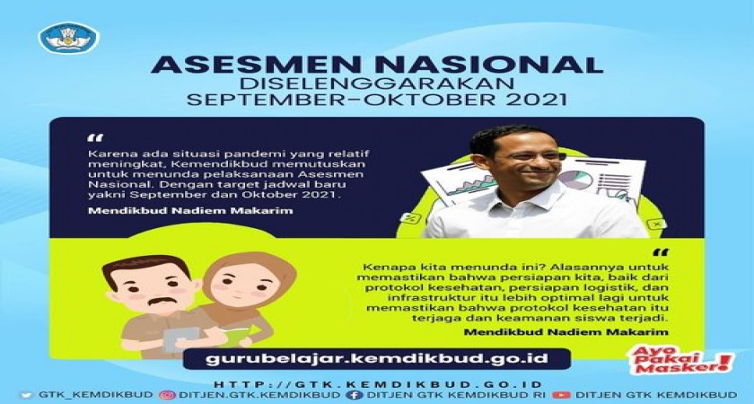 Kementerian Pendidikan dan Kebudayaan (Kemendikbud) memutuskan untuk menunda pelaksanaan Asesmen Nasional (AN). Jadwal AN pun bergeser menjadi September dan Oktober 2021.