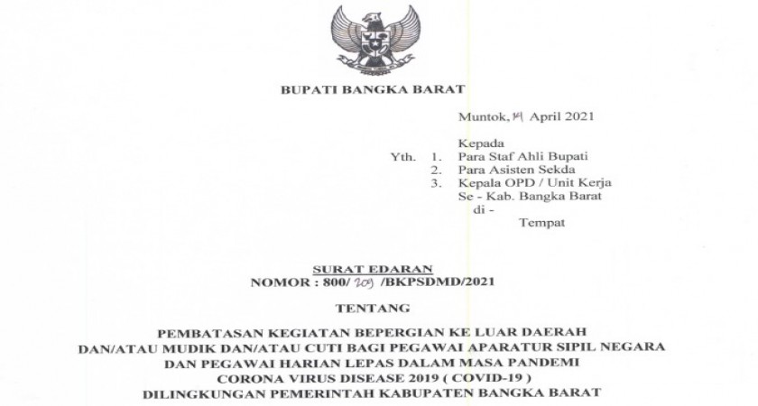 SE Bupati Bangka Barat Pembatasan Bepergian Cuti Mudik ASN dan PHL Tahun 2021