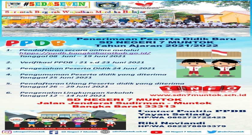 Mari sekolah di SD Negeri 7 Muntok dan bergabung menjadi keluarga besar #Sedaseven. Adapun teknis Penerimaan Peserta Didik Baru TA 2021/2022 yaitu: