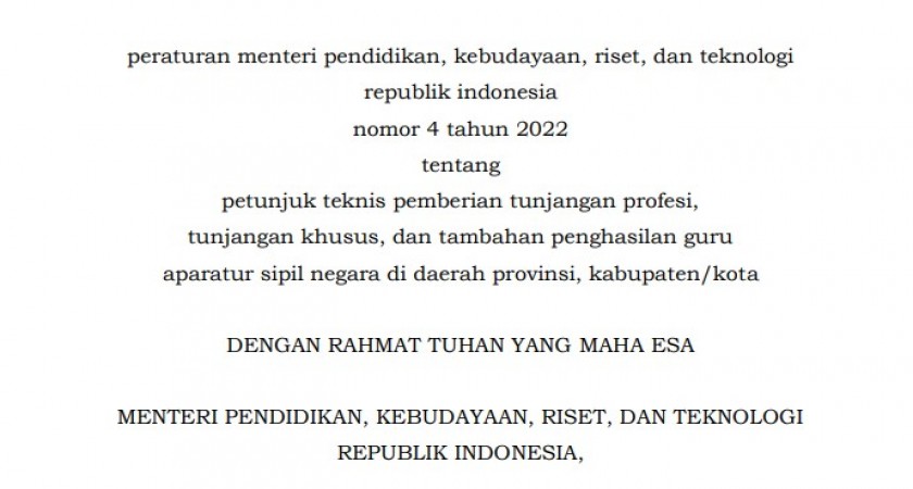 Hal itu tertuang dalam Permendikbud Nomor 4 Tahun2022 tentang Petunjuk Teknis Pemberian TunjanganProfesi, Tunjangan Khusus, dan Tambahan PenghasilanGuru ASN di Daerah Provinsi, Kabupaten/Kota.