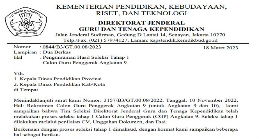 Pengumuman Seleksi 1 CGP Angkatan 9 Babel