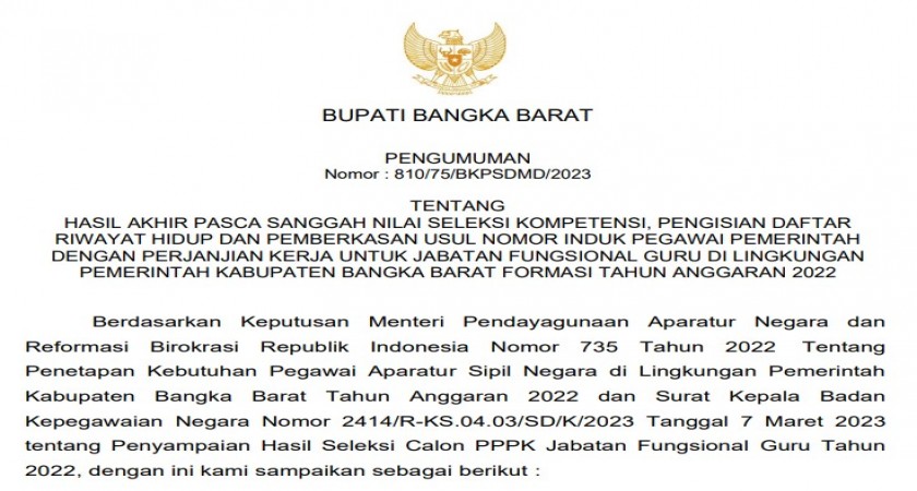 Berdasarkan Keputusan Menteri Pendayagunaan Aparatur Negara dan Reformasi Birokrasi Republik Indonesia Nomor 735 Tahun 2022 Tentang Penetapan Kebutuhan Pegawai Aparatur Sipil Negara di Lingkungan Pemerintah Kabupaten Bangka Barat Tahun Anggaran 2022 dan Surat Kepala Badan Kepegawaian Negara Nomor 2414/R-KS.04.03/SD/K/2023 Tanggal 7 Maret 2023 tentang Penyampaian Hasil Seleksi Calon PPPK Jabatan Fungsional Guru Tahun 2022.