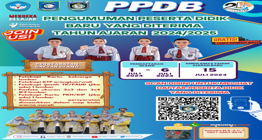 Berikut disampaikan daftar nama-nama peerta didik baru tahun ajaran 2024/2025 yang diterima di SD Negeri 7 Muntok. Kami ucapkan selamat datang dan bergabung menjadi keluarga besar SD Negeri 7 Muntok. Untuk formulir pendaftaran ulang silahkan datang langsung ke sekolah mulai pukul 08.00 s.d 12.00 wib dari tanggal 1 s.d 6 Juli 2024.