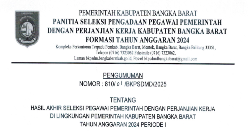Menindaklanjuti surat Pit. Kepala Badan Kepegawaian Negara selaku Ketua Tim Pelaksana Seleksi Nasional Pengadaan CASN 2024 Nomor : 11336/B-KS.04.03/SD/K/2024 tanggal 28 Desember 2024 perihal penyampaian hasil seleksi kompetensi PPPK Tenaga Teknis, surat Pit. Kepala Badan Kepegawaian Negara selaku Ketua Tim Pelaksana Seleksi Nasional Pengadaan CASN 2024 Nomor : 11858/B-KS.04.03/SD/K/2024 tanggal 29 Desember 2024 perihal penyampaian hasil seleksi kompetensi PPPK Tenaga Kesehatan Tahun Anggaran 2024.